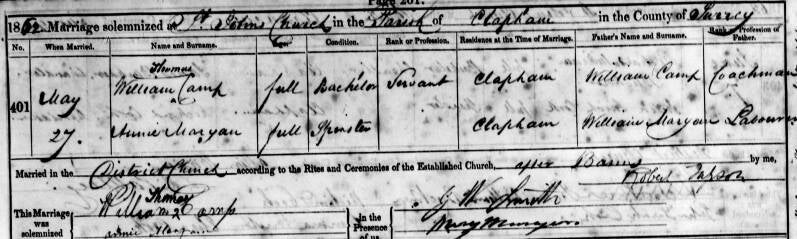 William Thomas a servant married Annie Maryan the daughter of William a labourer, on the 27th day of May 1862, at St. John’s Church, Clapham in Surrey (South London.)