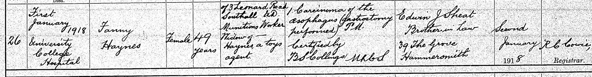 Fanny a munitions worker of 3 Leonard Road, Southall, died on the 1st of January 1918, at the University College Hospital of carcinoma (cancer) of the oesophagus (a tube from the throat to the stomach.)